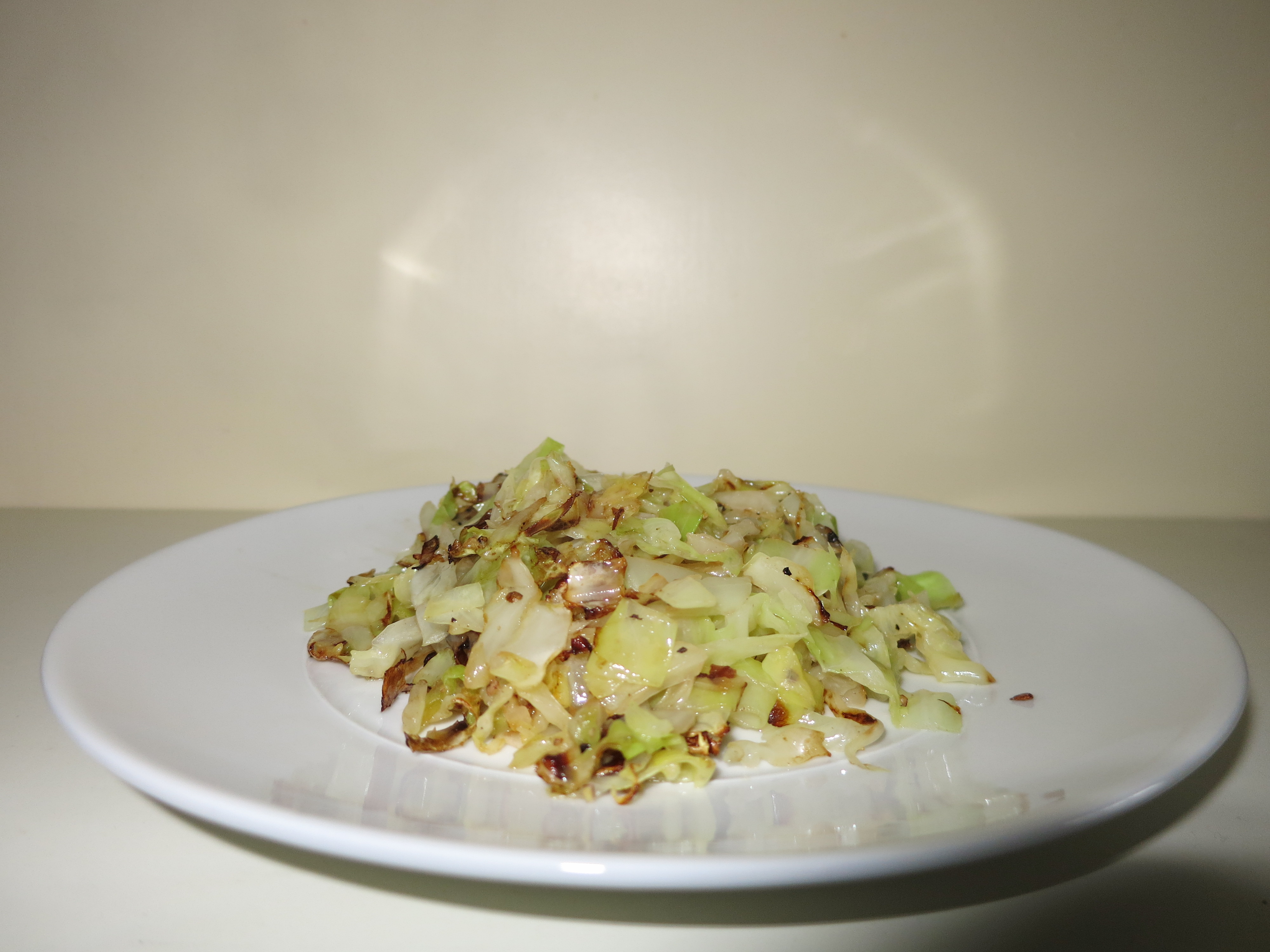 Stir every minute or so and remove from heat when the cabbage has some nicely browned edges. Depending on your stove top and pan, this should take about 5 minutes.