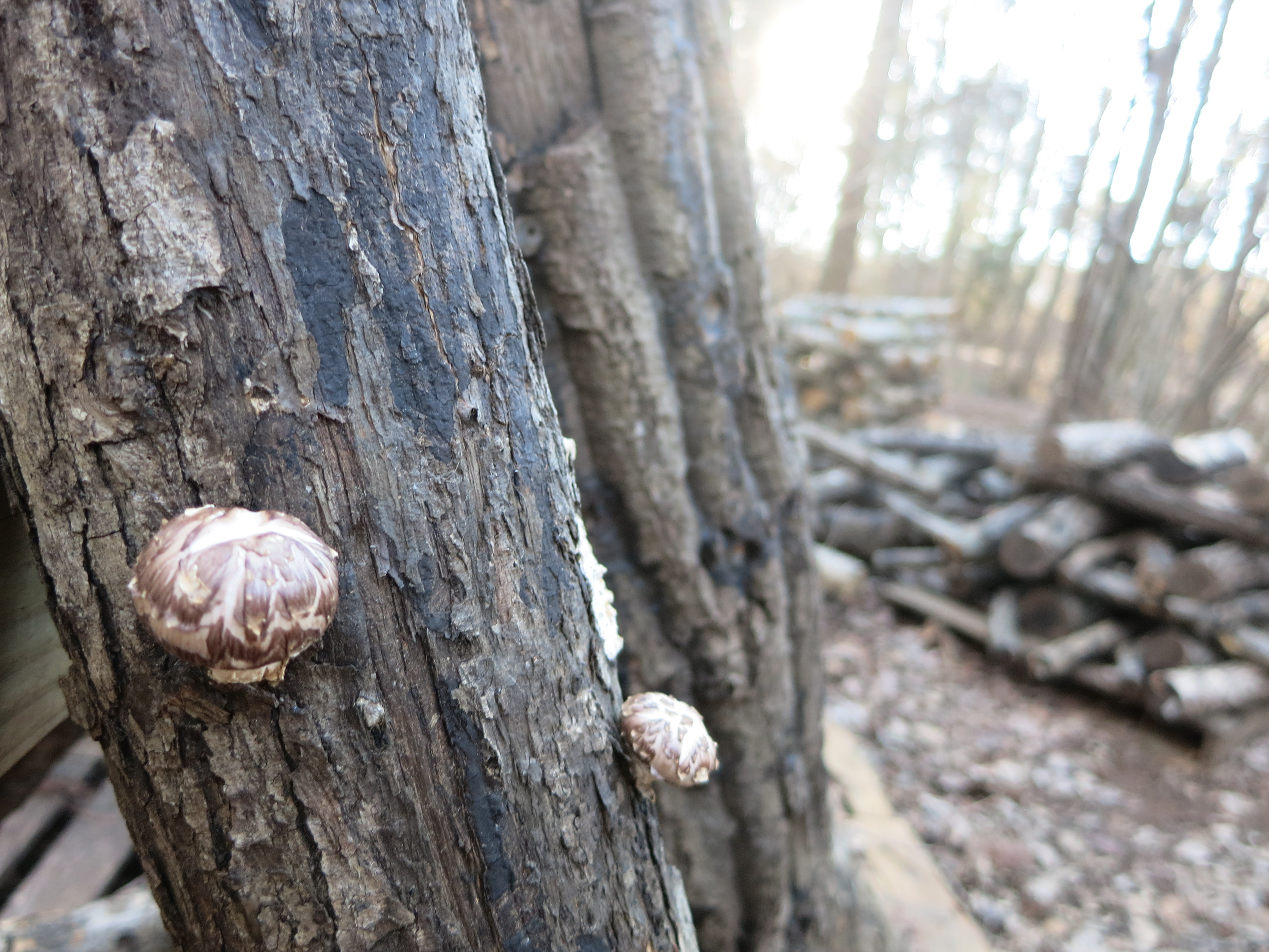 Shiitakes starting on the logs innoculated 2 years ago.