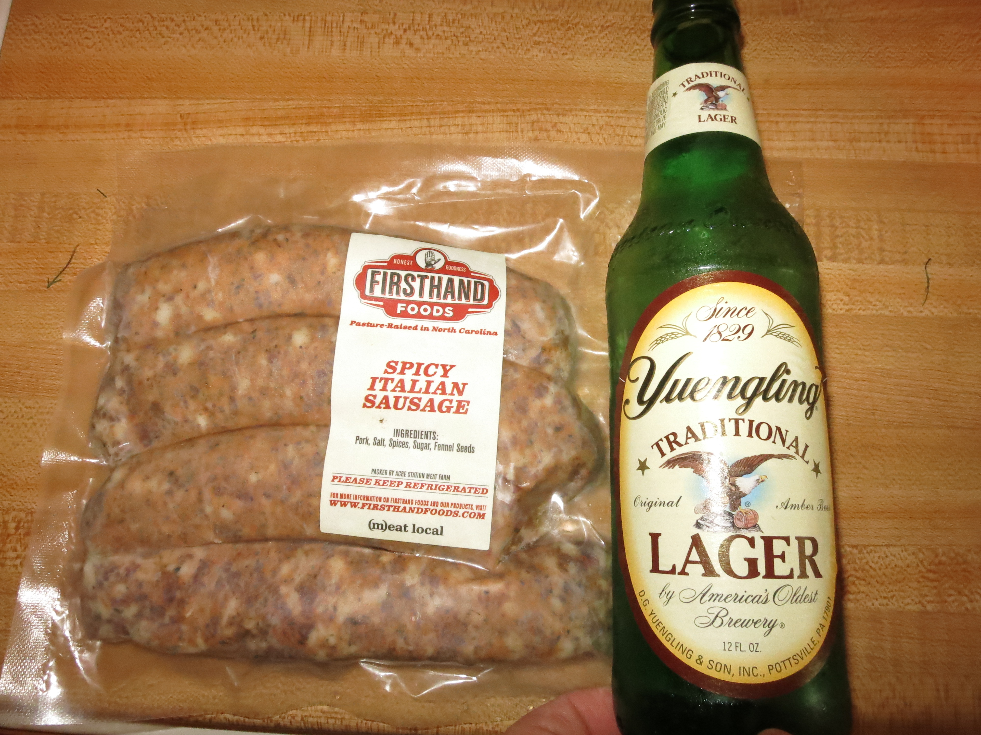 Turns out we had a little hitch in our giddy-up…rain! Instead of putting the sausages on the grill, we ended up poaching them in beer on the stovetop and when the rain eased back, putting them on the grill for just a few minutes to get some nice color. Perfect hybrid!