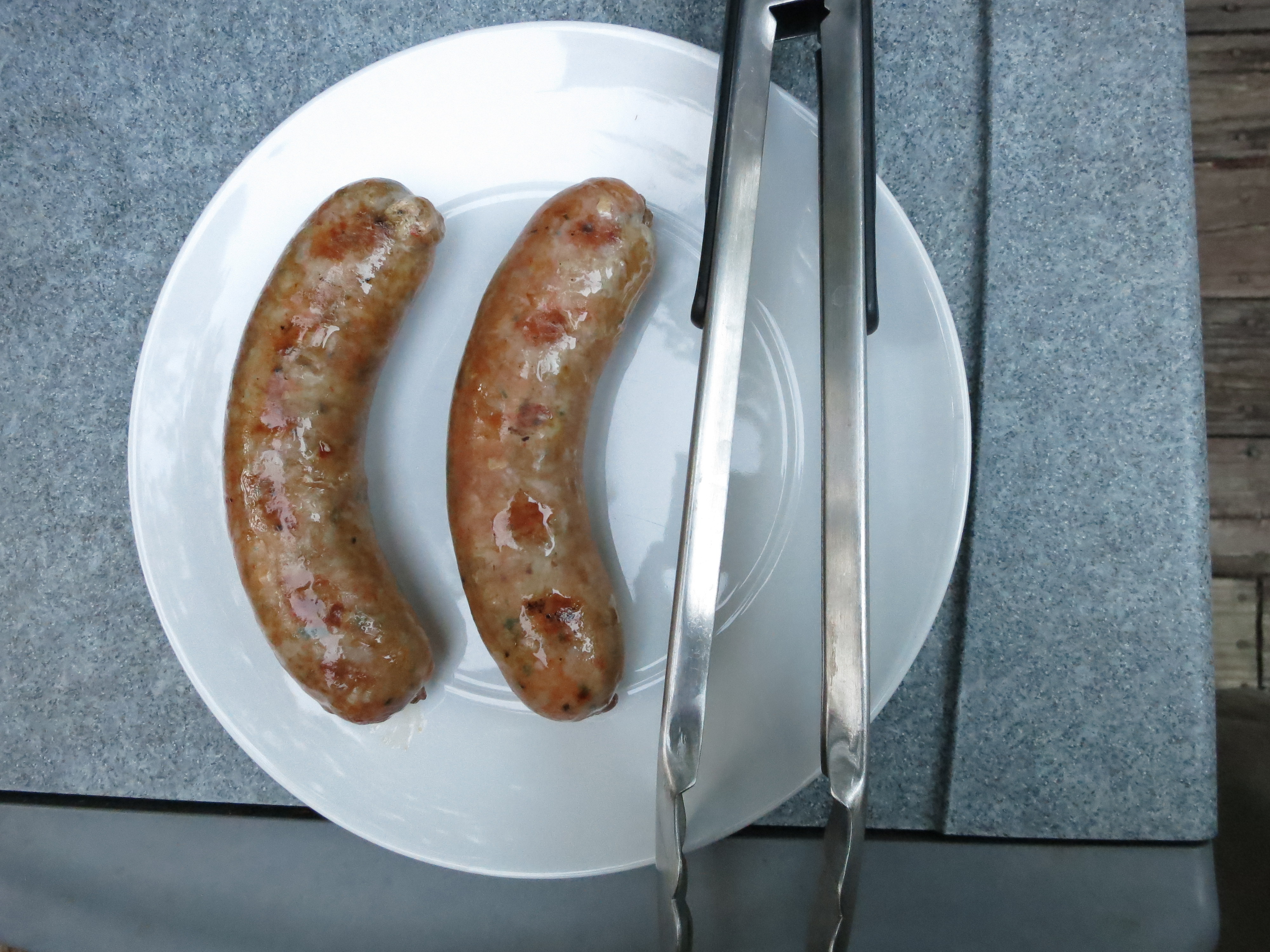 Their handy tip sheet for cooking sausage cautions “Too high heat and the casing will split, releasing all of the tasty fat and juices.” Finally, some real incentive to keep the heat on medium and get them off in a timely manner! Of course, we could use a meat thermometer to ensure they reach the desired 145 degrees, but where’s the adventure in that?