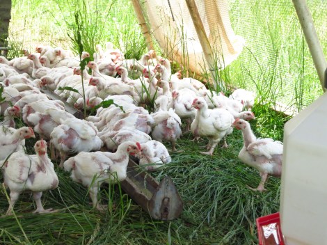 In one of the open fields are a couple of open bottom, tarp-covered chicken coops housing about 200 Cornish Cross chickens, specifically bred for meat production. They’ll sell these about 7 to 8 weeks after they receive them, by which time they weigh around 3 to 3.5 pounds. John stays busy, receiving a new batch of chicks in the mail about every two weeks. The ones in these photos were too young for feathers.