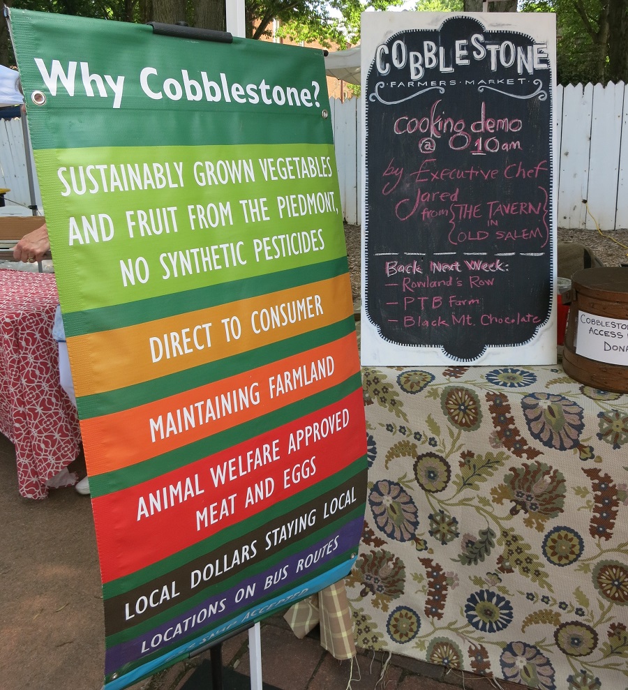 “Cobblestone Farmers Market is North Carolina’s only fully vetted, sustainable, producer-only farmers market offering customers the guarantee that all vendors meet the sustainable, naturally-grown, and humane practices required by the market. All beef, lamb, and pork products are certified Animal Welfare Approved […] For value added products, local and sustainably produced ingredients are strongly preferred, and where possible, ingredients should be grown by the vendor (e.g. pickles, jams, etc., but not necessarily baked goods).”