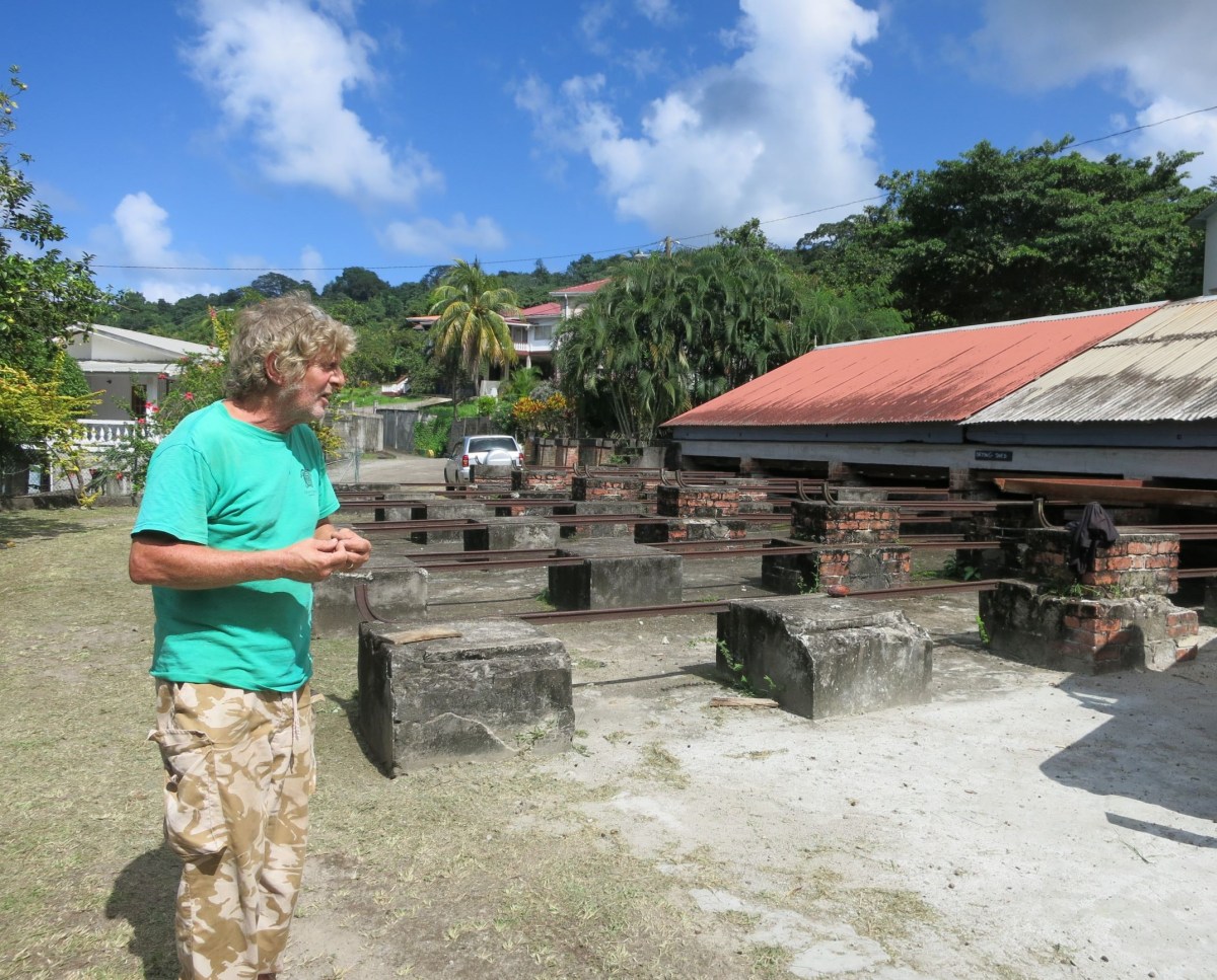 IMG_5793 Published July 27, 2019 at 2148 × 1732 in Crayfish Bay Organic Cocoa Estate – Grenada ← Previous Next → Kim (green shirt) showing us the drying racks that roll out onto these rails where the beans are dried in the sun